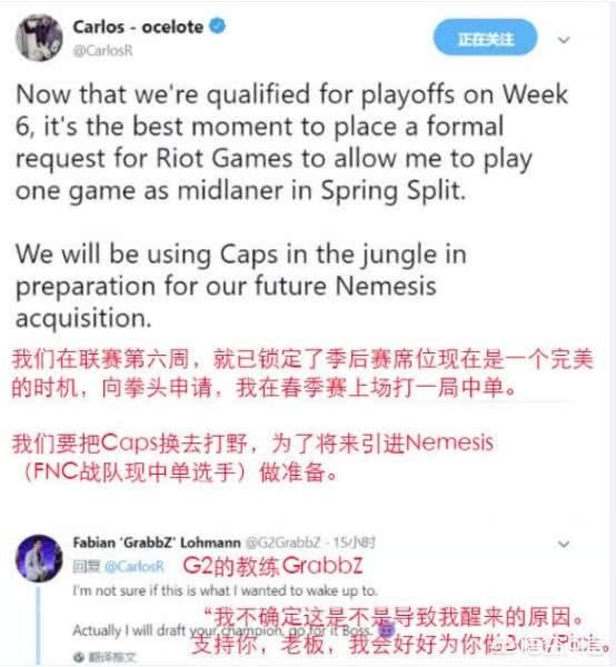 回归主题,G2老板在facebook上已经表示会像王校长那样向拳头官方申请出赛资格!不过唯一不同的是G2老板Ocelote其实是职业中单出身,还曾经代表SK征战过S2世界赛,这是要做回老本行吗?而且作为老板,一言一行当然有着员工支持,G2的教练GrabbZ就立即表示了自己对于老板上场打中单的无条件支持。老板我支持你,会好好给你做BP的!
