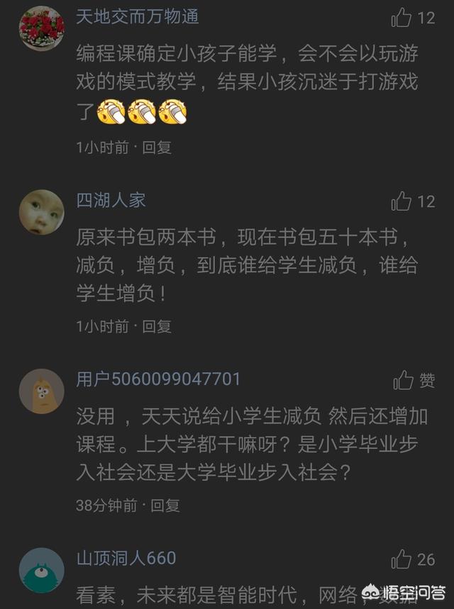 事实上早在2017年7月,国务院就印发了《新一代人工智能发民规划》,其中明确指出“在中小学阶段设置人工智能相关课程,逐步推广编程教育”。今年,教育部将实施学生信息素养培育行动,完成义务教育阶段学生信息素养评价指标体系,建立评估模型,启动中小学生信息素养测评;同时推动大数据、虚拟现实、人工智能等新技术在教育教学中深入应用。这样看来,这种自上而下的推动,是时代的需求,是强国计划的一部分,要为中国培养适应未来的科技人才所做的规划,时代在发展,教育的内容也要进步与调整,但是对于中小学的课业负担有没有真正的减负,家长们就有了不同的声音!
