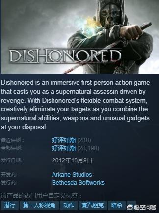 《耻辱》是一款第一人称潜入/暗杀/动作冒险游戏,故事背景描述了一个被杀死了雇主的保镖,steam上也获得了好评如潮的等级。