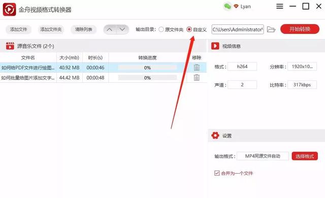 第四步、本软件所默认的文件保存位置为原文件夹,如果需要更换,可勾选软件上方“输出目录”中的“自定义”按钮,然后再选择新的保存位置。