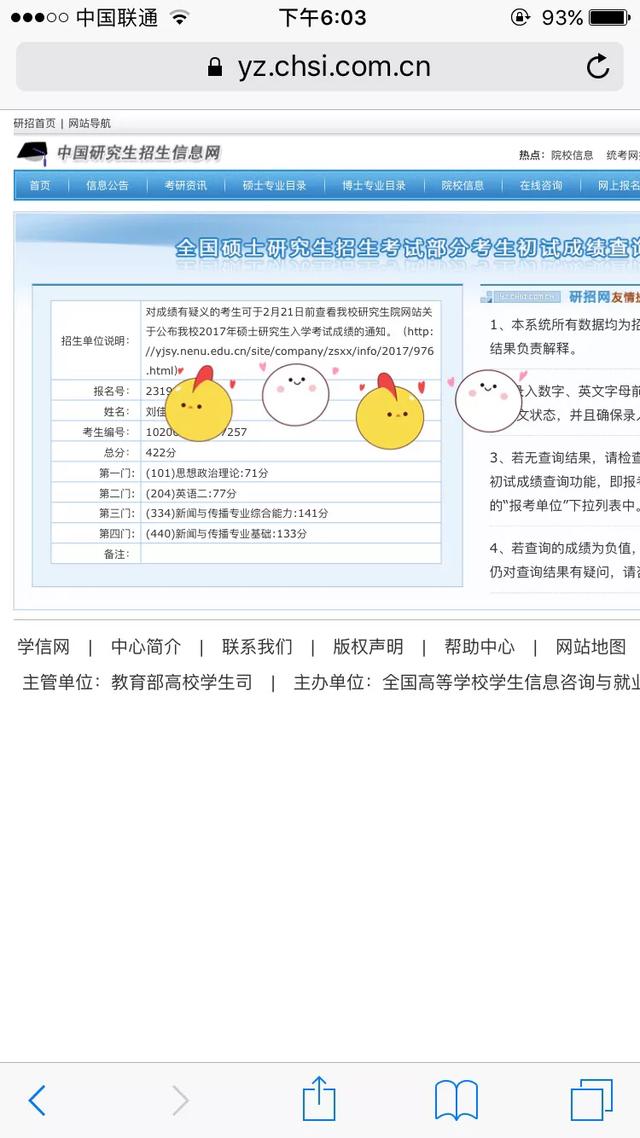 2月15下午6点,公布成绩的那刹那。总分422分,英语77,政治71,专业课一141,专业课二133,初试第四名。