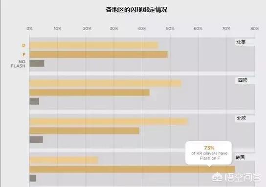 各赛区的df键位设置都有属于自己赛区的风格 北美f比d略高 西欧和北欧都是大多d闪现键位 而韩国的闪现键位设置则是随了魔王李相赫呀 达到了百分之七十三的f键位占比 不愧为第一赛区 看来闪现键位得去研究一波了
