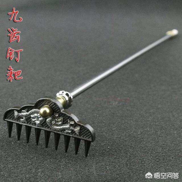 九齿钉耙全称上宝沁金耙,是太上老君用神冰铁打造一件礼器,至于九个齿的数字是因为单数最大吧。其实攻击性,实用性并不强,大约两三顿重,可能是当年八戒来人间走的急,顺手就抄了一把,跟着他一块从天上掉下来的。在跟着唐僧取经的时候,耙子也没起到什么很大作用,反而由于重量太大拖累了他,经常被妖怪给抓去。却给以后带来了不少的“哽”,例如郭德纲相声里面经常出现的表演内容就有它。它还给我们带来了一段美好的音乐,“当当地聋给当”。