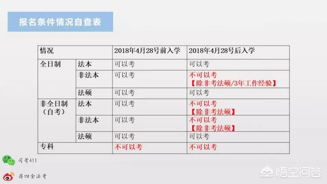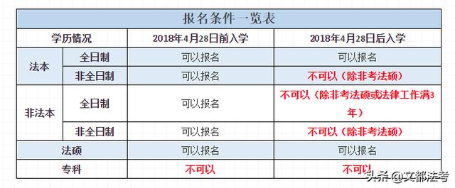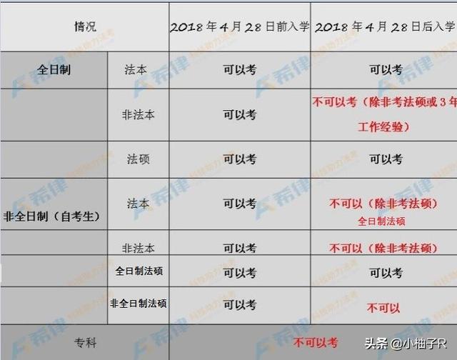 2018年4月28日之后入学的非法本全日制同学,虽然不可以报考,但是考上法硕或者拥有法律相关行业的3年工作经验的话,仍然允许报考;