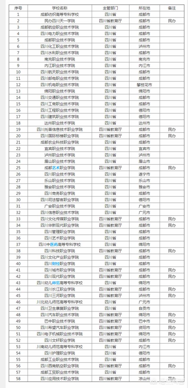 四川省的专科学校还是比较多的,据教育部最新的备案信息,总共有58所高职高专院校,其中包括18所民办职业院校,40所公办高职院校。