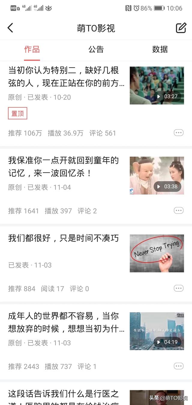 我从刚开始做自媒体到现在已经有将近两个月了,刚开始就是拍一些个人VOLG,为此还购买了云台,手持设备等一系列配件,做好了完全的准备,刚开始不好意思露脸,就拍一些风景,添加上背景音乐,反响平平,推荐量和播放量加起来都不超过500的样子,再后来开始自己露脸去拍自己的日常等,效果更是一塌糊涂。在这里劝大家,如果自己的日常生活并没有很吸引人的东西,那还是不要去拍了,没有营养的东西拍出来也是不受众的,更别谈去吸引人了。再后来听从别人的意见去做二次原创,就是在网络上找一些素材通过自己的加工,变成自己的原创视频,就是我现在做的萌TO影视,比之前要好很多。也有几篇小爆文,也有部分收益,但是一段时间后视频的播放量和推荐量逐渐下降,每个视频的播放量也就是3位数,虽然很失望,但还是想要坚持下去,因为刚开始做不可能每一篇视频都会火,因为没有粉丝基数,你也没有一个定性去吸引大众,所以只能慢慢来,发掘自己的想法,去做自己风格的视频,一旦有人开始喜欢你的这种风格,那就会慢慢累积资源和人气。所以,这是一个坚持的过程,前期有很大的蛰伏期,要坚持下去,总会成功的,没有必要因为刚开始的人气低落而去影响心情。加油!