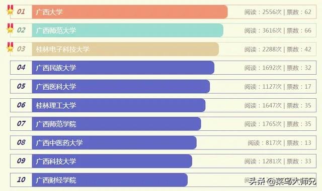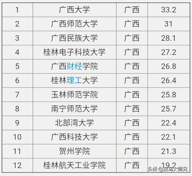 大家看看菜鸟整理的这个排名情况,很多比较有名的高校都是在这个排行榜之中了,尤其是广西师范学院改名之后,成为北部湾大学了,这个菜鸟需要说明一下,别的没有什么问题。