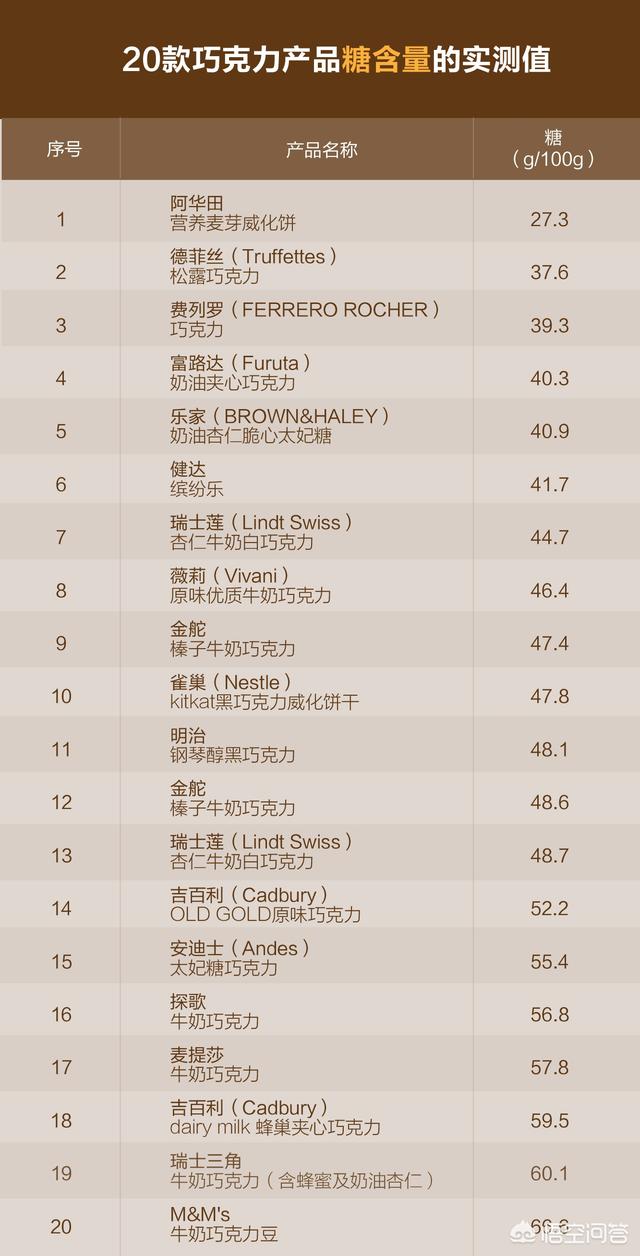 测试结果显示,20款巧克力的含糖量平均值为48.4g/100g,全部属于高糖食品(≥15g/100g)。即使是糖分最低的阿华田营养麦芽威化饼,100g所含糖分就超出了每天推荐摄入量。