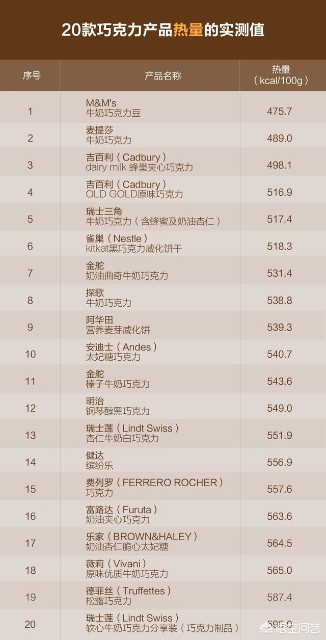 测试结果显示,20款巧克力每100g所含的热量为475.7kcal~595.0kcal。从品种而言,黑巧克力所含热量并不低,比如明治钢琴醇黑巧克力,其热量(549.0kcal)甚至高于20款巧克力的热量平均值(540.0kcal)。