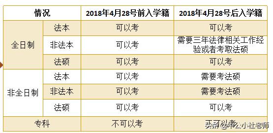 2018年法考改革,2018年4月29日以前取得本科毕业证的称为“老人”,“老人”只要是本科学历就可以报考;2018年4月29号以后入学的是“新人”“新人”有两个硬性要求:一是必须是全日制本科及以上学历,二是必须是法本法硕及以上“非法本要求三年及以上法律相关工作经验”