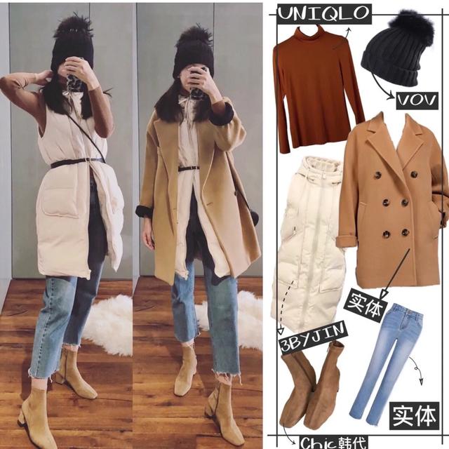 把羽绒马甲搭配在大衣里,保暖又美观,