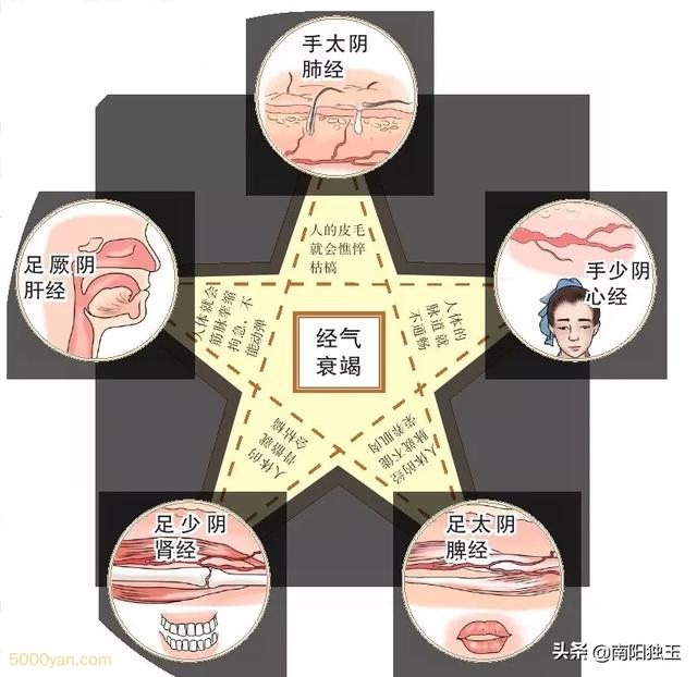 在《黄帝内经·灵枢篇》里有详细描述。如果手太阴肺经的经气衰竭,人的皮毛就会憔悴枯槁。因为手太阴肺经能够运行气血而温润肌表的皮肤和毫毛,所以如果肺经的经气不足,气血无法运行,皮毛就会焦枯;出现了皮毛焦枯的病象,就表明皮毛已经丧失了津液的滋养;皮毛没有津液的滋养,就会出现爪甲枯槁、毫毛断折脱落等现象;出现了毫毛断折脱落的现象,就是毫毛已经死亡,肺经精气衰绝了。这种病证,逢丙日就会加重,逢丁日人就会死亡,原因是因为丙、丁属火,肺属金,火能克金。