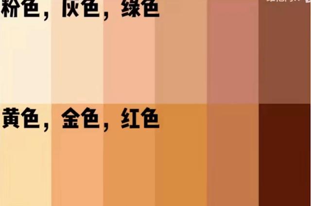 第1行呈现肤色对应皮肤底色粉色、灰色和绿色,属于冷色调。第2行则对应皮肤底色黄色、金色、红色则属于暖色调。
