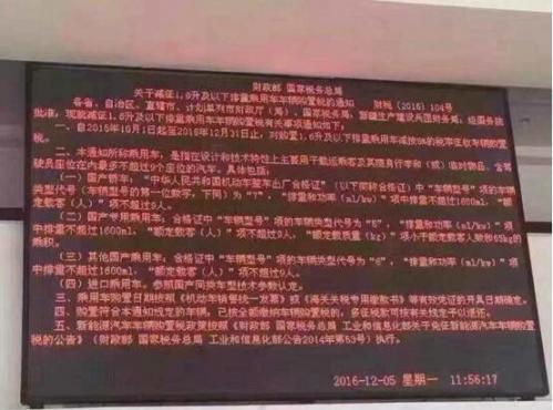 近日小编走访了车管所,在信息预览屏下看到了关于车辆购置税的说明,为求证在这一信息的是否得到官方证实,于是在国家税务总局的官方网站上找到了关于减征1.6升及以下排量乘用车车辆购置税的通知,通知如下:
