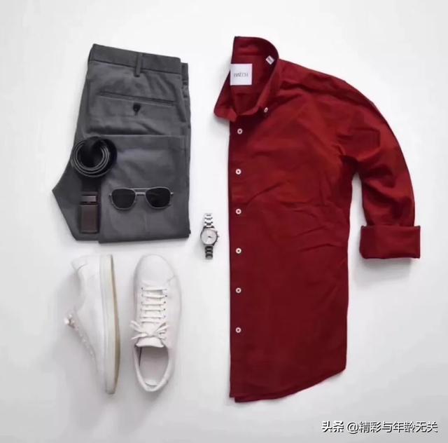 红色衬衫➕灰色休闲裤➕白色休闲鞋