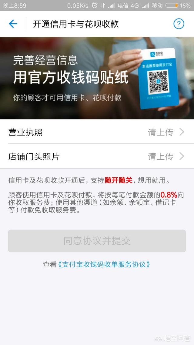 然后点击“花呗收钱”,之后上传自己的营业执照以及店铺门头照片就行了,若开通时没有营业执照,可以在上传页面中选择“没有营业执照”,按照页面提示上传食品卫生许可证等其他经营资质代替的