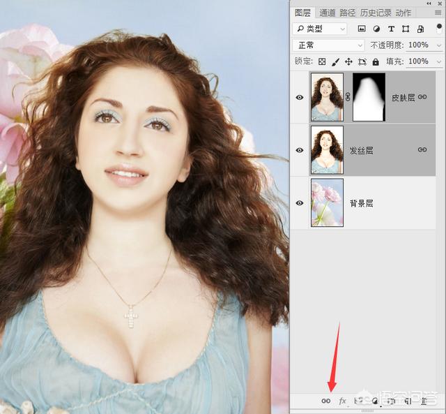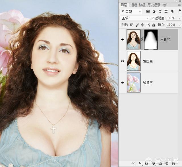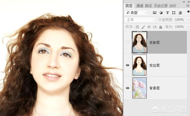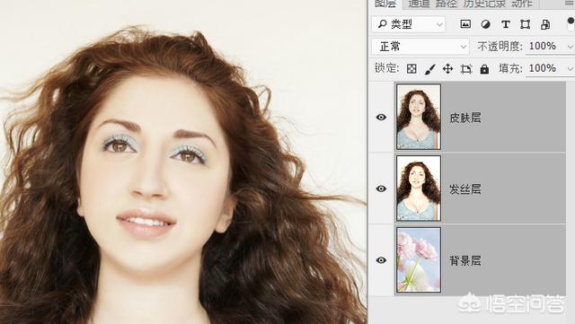 6.到这里准备工作就做好了,为了那些不太熟悉PS的朋友在后面操作的时候不乱套,建议你可以将三个图层的名称修改一下,直接在图层名称位置双击鼠标就可修改。从上到下依次修改为:皮肤层、发丝层、背景层。