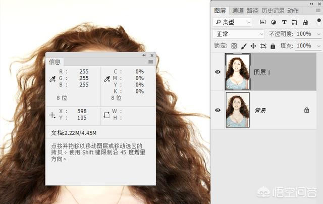 2.调整好以后如果你不确定是不是纯白,你可以在窗口里打开信息对话框,多个区域检测一下,看看色值是不是都是三个255。这里需要注意的是调整纯白背景时候一定要观察发丝的损失程度,可以少许损失,不能损失太多。