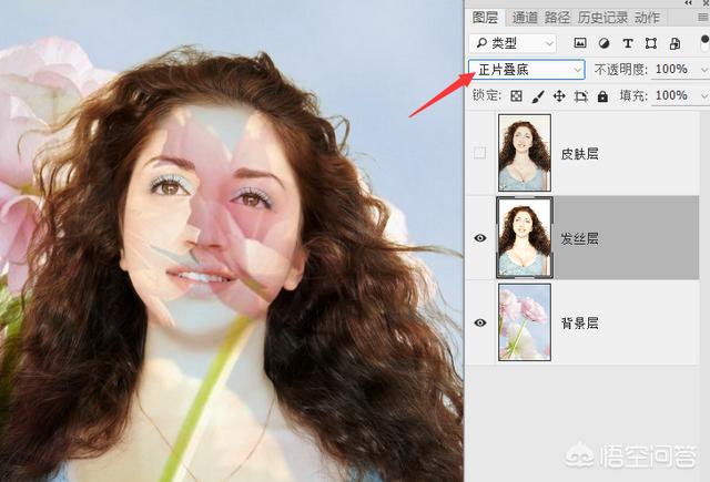 8.选择中间的发丝层,修改它的混合模式为正片叠底,此时可以看到白色背景已经消失了。不过随之而来的效果就是皮肤的部分也变得透明了,这是因为皮肤中也包括一部分白色被过滤了。