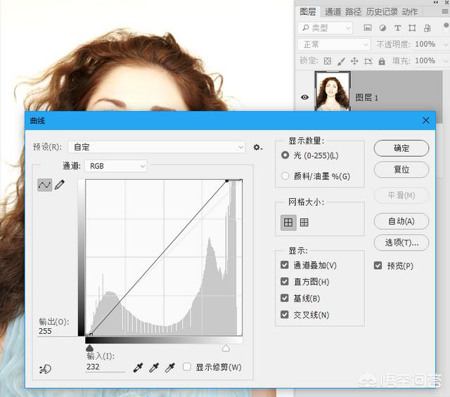 1.啥话也不说,直接复制一层,给复制的图层上曲线,利用曲线将画面中的浅灰色背景调成纯白色背景。如果照片是带颜色的背景(蓝色、绿色、粉色等),你需要复制图层后利用图像菜单下调整里面的黑白命令去色,去色过程中把背景颜色所对应的滑块调到最亮。