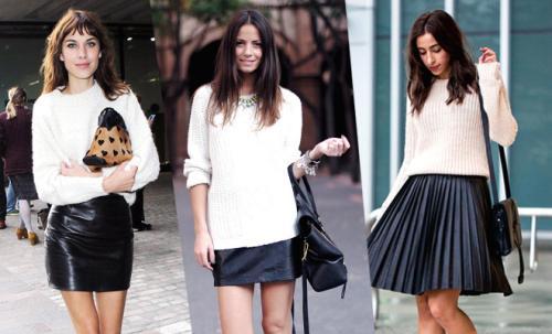 其实,除了毛衣搭配皮裤很帅以外,毛衣和皮裙的结合率性中多丝女孩纸的甜美↓