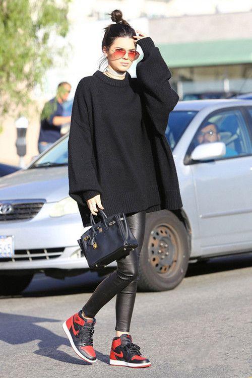 黑色长款毛衣+皮裤,整体的黑色会显得身材高挑,红色和黑色本身就是很霸气色系,这两色的配合堪称“完美”~