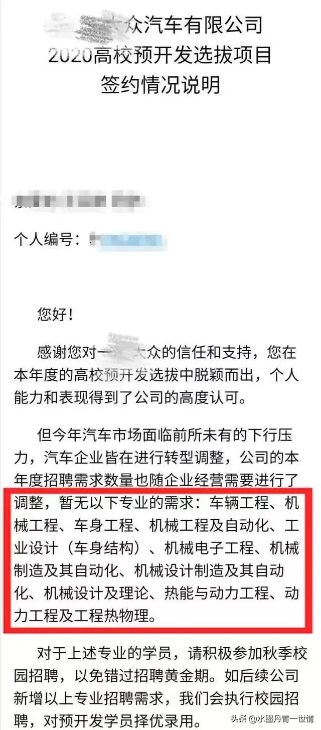 对于一汽大众取消机械专业校招,本人觉得主要有两点: