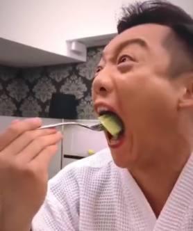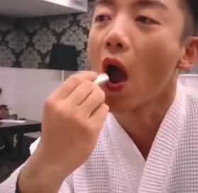 虽然男生很少涂口红,不过郑恺为了拍视频还是涂上了好几层,涂完口红后他拿起了一块水果。