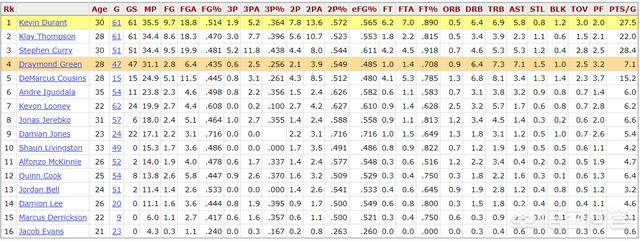 本赛季场均7.1次助攻创生涯新高并且位列全队第一,7.3个篮板球位列队中第二位。这两项数据就可以体现格林在勇士进攻体系的重要性。但是,场均三分球命中率生涯最低仅为25.6%,远低于生涯32.2%。这就造成了经常被对手放掉的情况,在进攻端被对手五防四的尴尬局面。