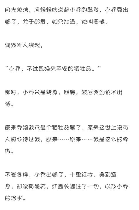 “乔莹……”周瑜看着这从小的玩伴,咽了口唾沐,心一恨,举起剑,朝她刺去。