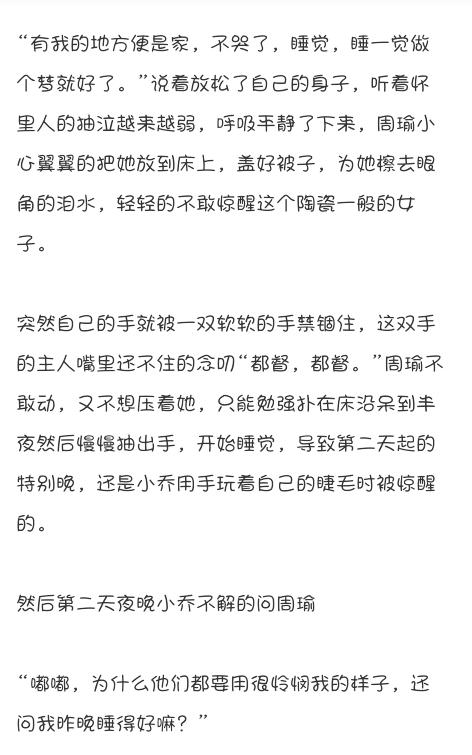 而周瑜呢也乐的去做,每一次做好一件事都要抱一下小乔,过了这么许久,小乔和周瑜早已躺在了床上(下面请自行脑补)