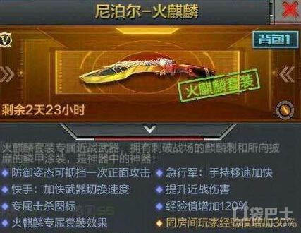第七:尼泊尔-火麒麟。这把近战武器最大的特点就是帅,我感觉它的出刀方式很炫酷,当然她有个很恶心的技能-格挡,队手打击他,自己却挂了,很恶心的一个技能,但是很受欢迎。这把近战武器等我获取方式好像只有氪金才能得到,在一些不定期的活动中出现,需要的可以关注一下我有活动我会及时发布。