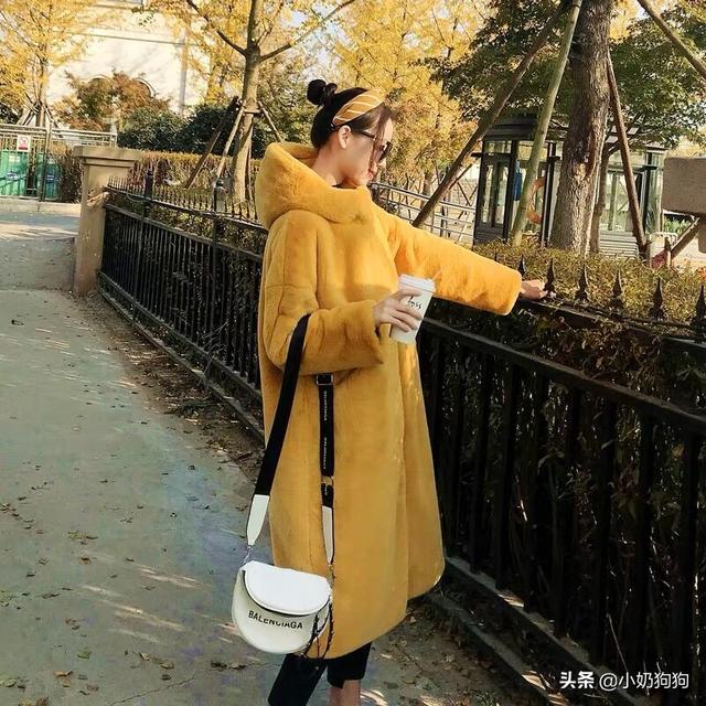 长款带帽兔毛皮草外套,下面搭配上打底裤、高跟鞋,整体效果高贵而又美丽。