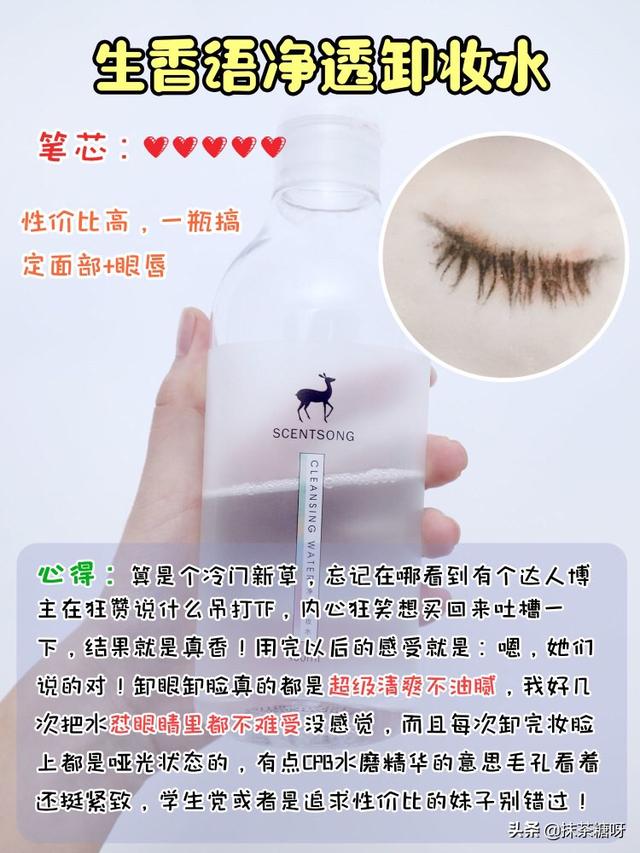 心得:算是个冷门新草,忘记在哪看到有个达人博主在狂赞,内心狂笑想买回来吐槽一下结果就是真香!用完以后的感受就是:嗯,她们说的对!卸眼卸脸真的都是超级清爽不油腻,我好几次把水怼眼睛里都不难受没感觉,而且每次卸完妆脸上都是哑光状态的,有点CPB水磨精华的意思毛孔看着还挺紧致,学生党或者是追求性价比的妹子别错过!