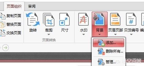2、打开文档后,首先在工具栏中选择“页面组织”-“背景”-“添加”。