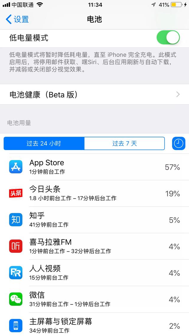 听了很多网友的建议,关机重启后也没有好转,这种情况持续到今天,没有下载安装App(后台更新已经关闭),耗电量仍然是App Store音频占大部分。