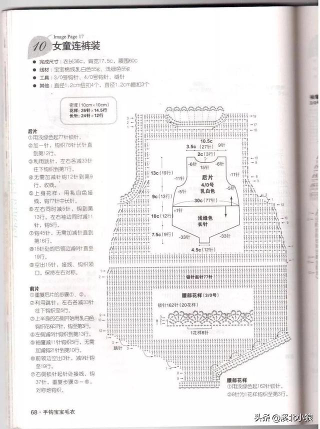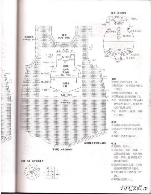 第五步左前片30针再绕针加上6针连起后片60针再绕针加上6针连起右前片,一直织到身子的长度。袖子的织法也和连身子一样把连身子加的6针挑起就可以连袖子了,织到袖子长度即可。门襟是最后挑织的,我挑门襟是一针里面挑两针,这样挑出的门襟平整好看。