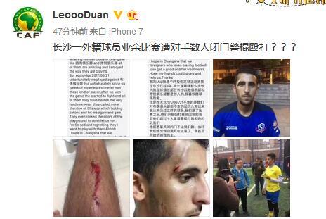 该外籍球员在朋友圈叙述的事件经过随后也被转载到了网上,“我是一位阿拉伯球员,我们和布欧俱乐部的比赛之后发生了不幸,我从未遇到过像这样的球员,当我们获胜后双方发生打斗,他们又叫来了10多个人来打我们,出手非常重,而且还是用棍棒类器械,不断击打我。为了不让我们逃跑,他们甚至把球场的门锁了起来。”此外,该外籍球员被打受伤的照片也被传到了网上。