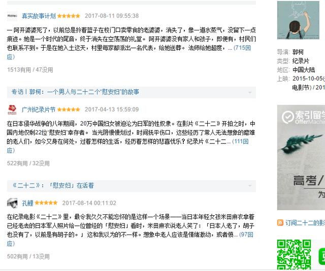 《二十二》,一部非常特别题材的电影,讲述曾经被迫成为日本侵华时期“慰安妇”的二十二人的人生故事,却在公映一周内票房就突破了一亿,创造了内地纪录片票房纪录,这说明中国当下的观众——当然主要是年轻人——并没有此前想象的那么不在乎历史,他们依然在关注历史。电影作为媒介和艺术形式,在当前社会具有特别影响力,而且可以带动其他所有媒体(包括自媒体)的跟进。《二十二》更多是保存了老人们晚年生活的实际状态,作为抢救性影像保存来说,值得肯定,即使从技术上来说不够那么“完美”,甚至从内容上来讲也有很多缺憾,然而这些都不是关键,关键在于有人去做。片尾升起的众筹名单,又具体的32099人的名字,电影院也已经有1亿票房,而且在持续增长,相信在院线下片之后,会有更多人通过不同的渠道来观看本片。
