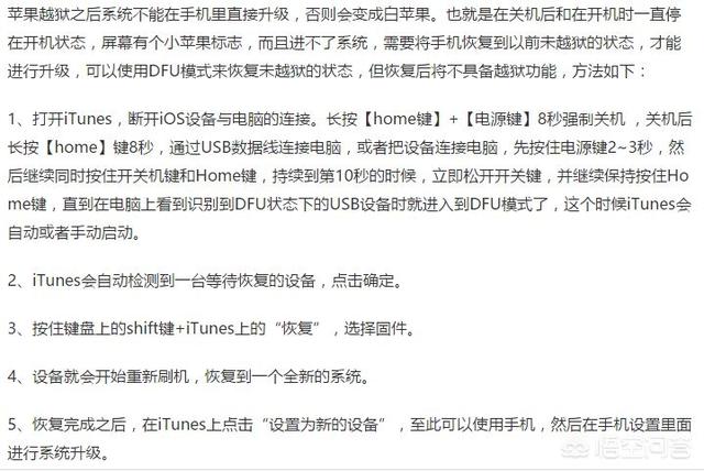 iPhone 越狱以后就不能通过手机内置的系统更新升级系统,所以只能通过刷机升级系统。刷机前备份手机上的数据,然后下载固件,用iTunes 或者其他手机助手都可以。推荐用爱思助手,完全傻瓜式的操作,备份数据以后,直接下载固件刷机即可,刷完机恢复数据就OK了