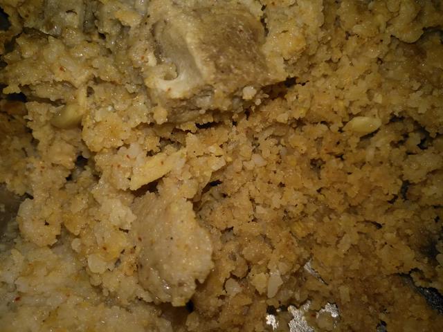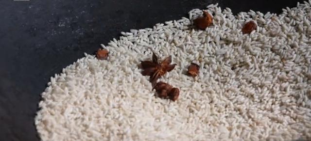 在肉片的过程中,我们处理一下大米:把大米和八角桂皮放锅里中火翻炒,炒至大米的表面金黄,然后把八角桂皮拿出来,然后用研磨机把大米打碎成有颗粒的米粉!
