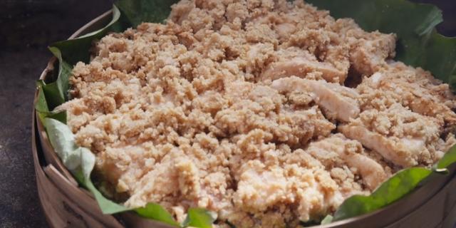 接下来,把腌制好的五花肉放到米碎里面,裹上一层米粉!然后,把裹上米粉的五花肉,整齐的摆放在放有荷叶的蒸笼里面!蒸锅上汽之后,把蒸笼放蒸锅里面,大火蒸15分钟!