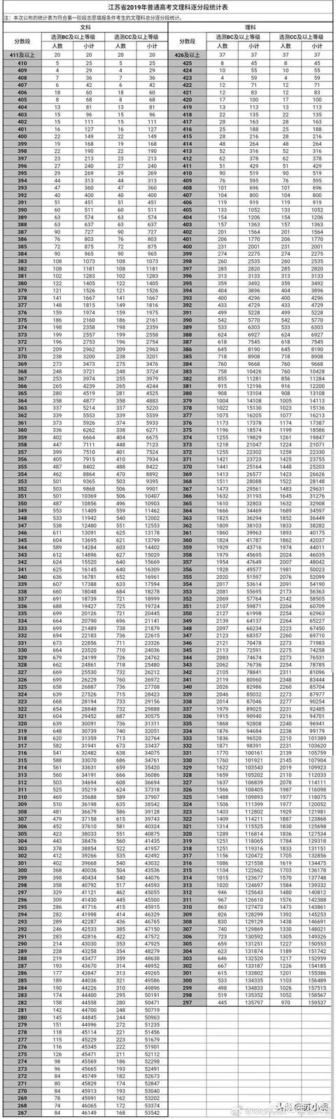 附表为2019江苏高考逐分段统计表,今年的分数比去年高,尤其是理科,不知道刚刚得知高考分的你们,究竟排在哪个分段呢?