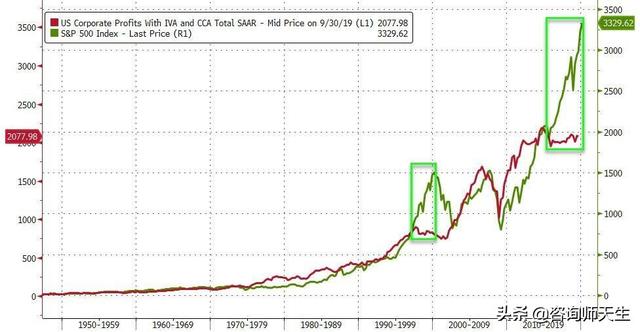 在2018年年尾时,美股开启了一波有效率下跌,当时,市场就对美股的估值水平持有高估值的看法,但是在2019年这一估值水平却再次被市场打破,并且走到了更高的位置上。
