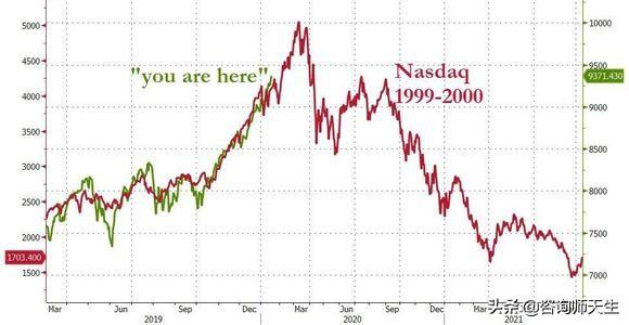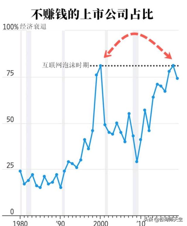 不过具体美股被高估了多少,这一点很难被精确的计算,而且一旦美股开始明显的下调,只可能会在恐慌情绪的趋势之下过度的下跌,因此下跌往往是要大于高估的比例的,这样就更难确定美股到底被高估了多少了,只能够说美股的风险和泡沫十分严重。图为美国股市当中不赚钱的上市公司,比例已经超过了2000年互联网泡沫破裂之前的水平。