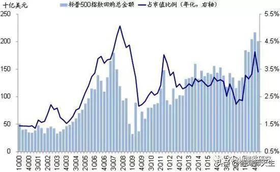 美国股市之所以存在较高的泡沫,来自于两方面的原因,第一是美联储宽松货币政策带来的泡沫升高,第二则是美国企业利用回购推升的股票市值。