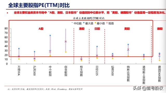 根据国金证券的研究,目前美股当中的标准500指数、道琼斯工业指数的估值中位数(滚动市盈率)和我们的A股整体的估值中位数是一致的水平,而纳斯达克指数的估值水平和我们中小板指数的估值相当,我们创业板的估值水平显然是最高的。