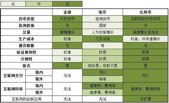 再贴上一个比特币推崇者列出来黄金、纸币与比特币的对比图吧。