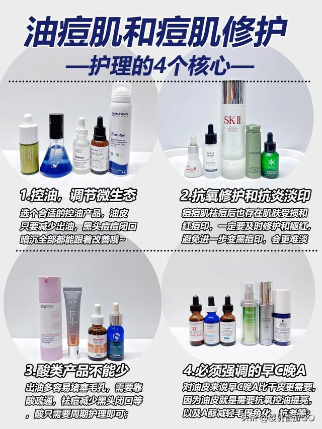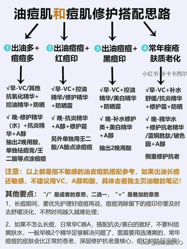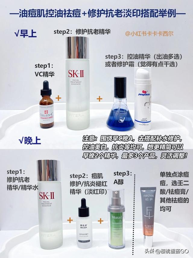 能控油,早上抗氧化减少光老化,提亮肤色,晚上抗老细腻毛孔,围绕这个根据需求搭配,比如大油皮配多控油产品,长期出油长痘受损肌搭配神仙水,红痘印搭配抗炎精华,黑痘印搭配美白精华等,先处理红痘印再解决黑痘印,参考图7。