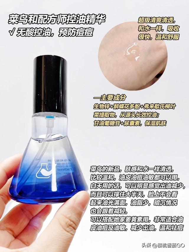 如果早C晚A不能控住,就增加控油产品,比如菜鸟和配方师控油精华,靠生物锌,醉蝶花多酚等从源头减少油脂分泌,肤感清透如水巨好吸收,早晚都可用,出油明显减少不会油光满面。